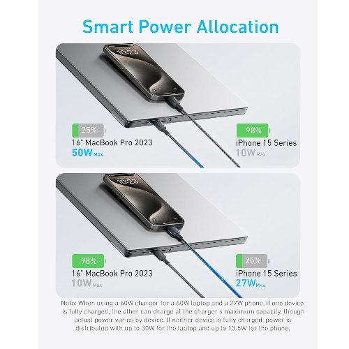 - Distribución inteligente de energía:La administración de energía inteligente incorporada adapta la potencia de salida para que coincida con los requisitos de carga de cada dispositivo conectado sin problemas. Nota: Consulte la guía de carga para comprender la asignación de energía al cargar dos dispositivos al mismo tiempo.