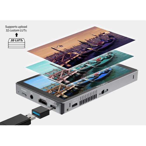 - Carga de LUTS 3D personalizados: admite carga de 32 LUT personalizados, 3D-LUT es una tabla para buscar rápidamente y emitir datos de color específicos. Al cargar diferentes tablas 3D-LUT, puede recombinar rápidamente el tono de color para formar diferentes estilos de color, 4 LUT DE-log integrados, también puedes cargar el archivo.cube personalizado a través del controlador flash USB (hasta cargar 32). lmport los archivos LUT al controlador flash USB se conecta al puerto tipo C del monitor a través del adaptador USB-A a USB-C conectado.