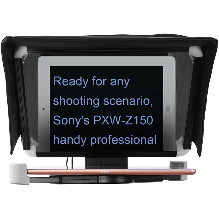 - teleprompter móvil montado en trípode con soporte para tabletas y smartphones; soporta tabletas de hasta 10,5″