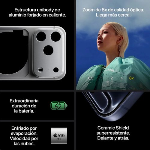 - CHIP A19 PRO. ENFRIADO POR EVAPORACIÓN. VELOCIDAD POR LAS NUBES. — El chip A19 Pro es el más potente en un iPhone y ofrece un rendimiento continuo hasta un 40% superior.