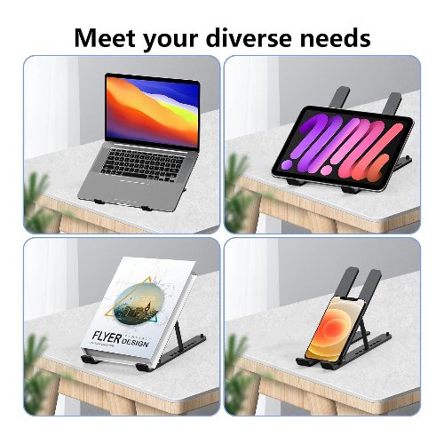 - Resistente y protector: el diseño de soporte triangular hace que el soporte para portátil sea más estable. La gran almohadilla de silicona antideslizante en el soporte puede asegurar tu laptop en su lugar y proteger al máximo tu dispositivo de arañazos y deslizamientos. Además, los bordes lisos nunca dañarán tus manos.